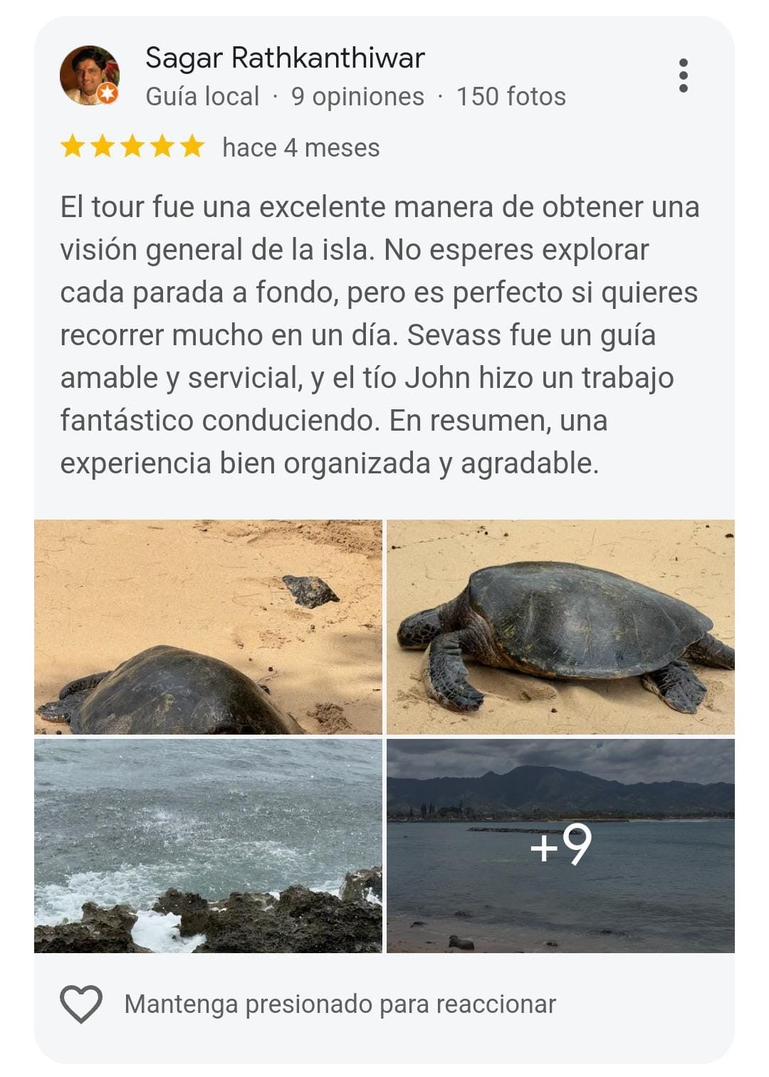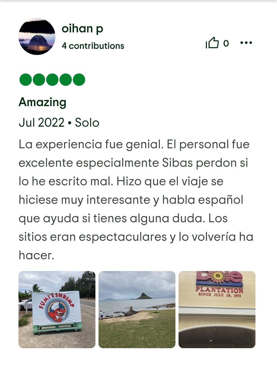 Gracias por considerarnos para llevarte por Oʻahu. Somos pequeños y boutique, como una familia, pero nos exigimos altos estándares de calidad y profesionalismo. Puedes llamarme en cualquier momento, estoy aquí para ti.
