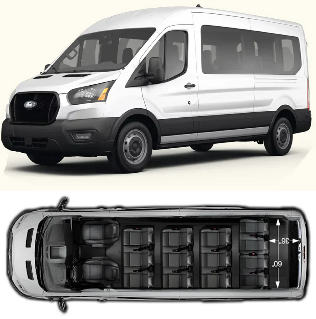 Nuestro Ford Transit es limpio, cómodo y diseñado para hacer turismo — con techos altos, grandes ventanas y una vista elevada.